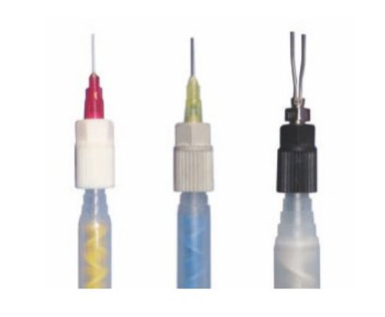 精(jīng)准点胶的(de)秘诀在(zai)于(yu)抑製(zhi)出胶量不均,材(cai)料拉絲(si),前(qian) 端爬胶等(deng)現(xian)象,進(jin)一(yi)步实現(xian)高(gao)品(pin)質(zhi)的(de)点胶。 在(zai)点胶针头前(qian)端及(ji)內(nei)径進(jin)行特殊材(cai)料的(de)表面处理(li),可(kě) 以(yi)实現(xian)更精(jīng)准的(de)点胶。請(qing)依照使用(yong)目(mu)的(de)与用(yong)途来选择 表面处理(li)的(de)种类。